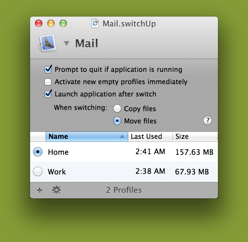 SwitchUp is a unique application that allows you to create, duplicate, and switch between multiple profiles of settings (preferences and data) for almost any application.