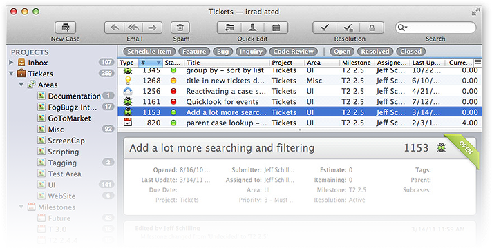 Tickets allows you to quickly create and edit FogBugz cases, including integrated screenshots and drag and drop attachments.