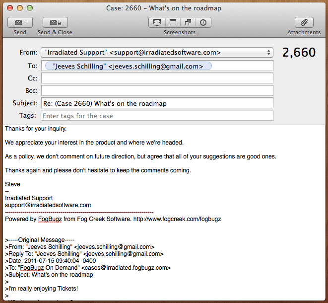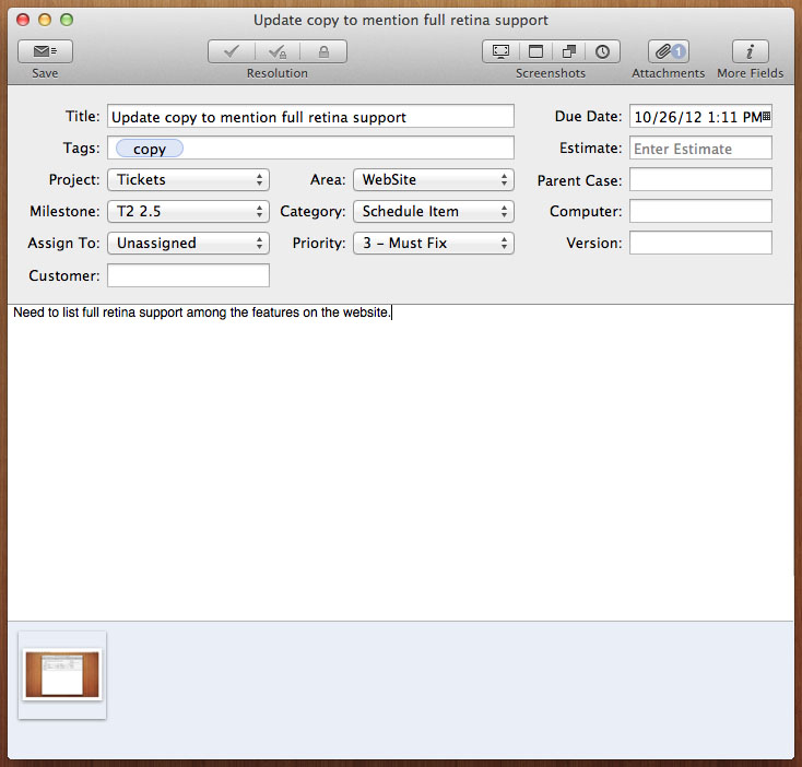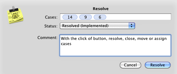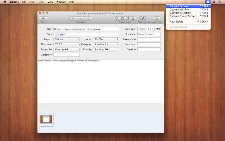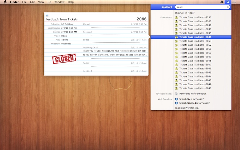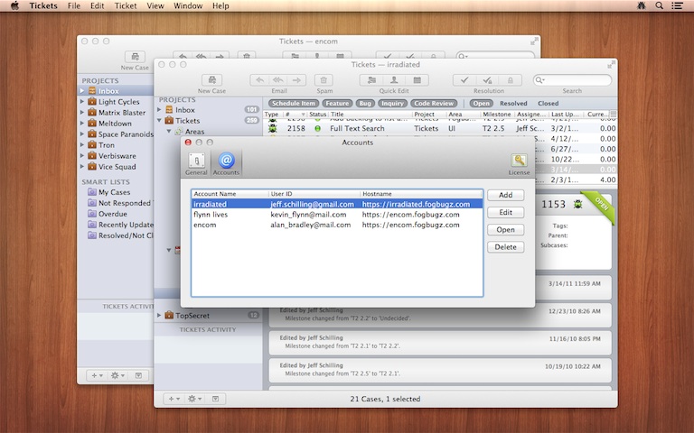 Tickets allows you to quickly create and edit FogBugz cases, including integrated screenshots and drag and drop attachments.