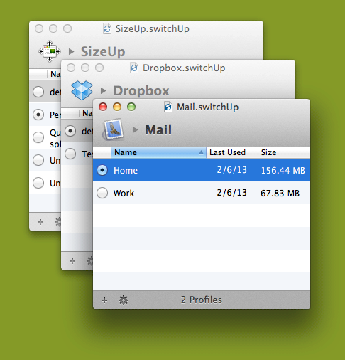 SwitchUp is a unique application that allows you to create, duplicate, and switch between multiple profiles of settings (preferences and data) for almost any application.