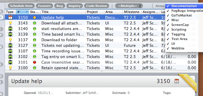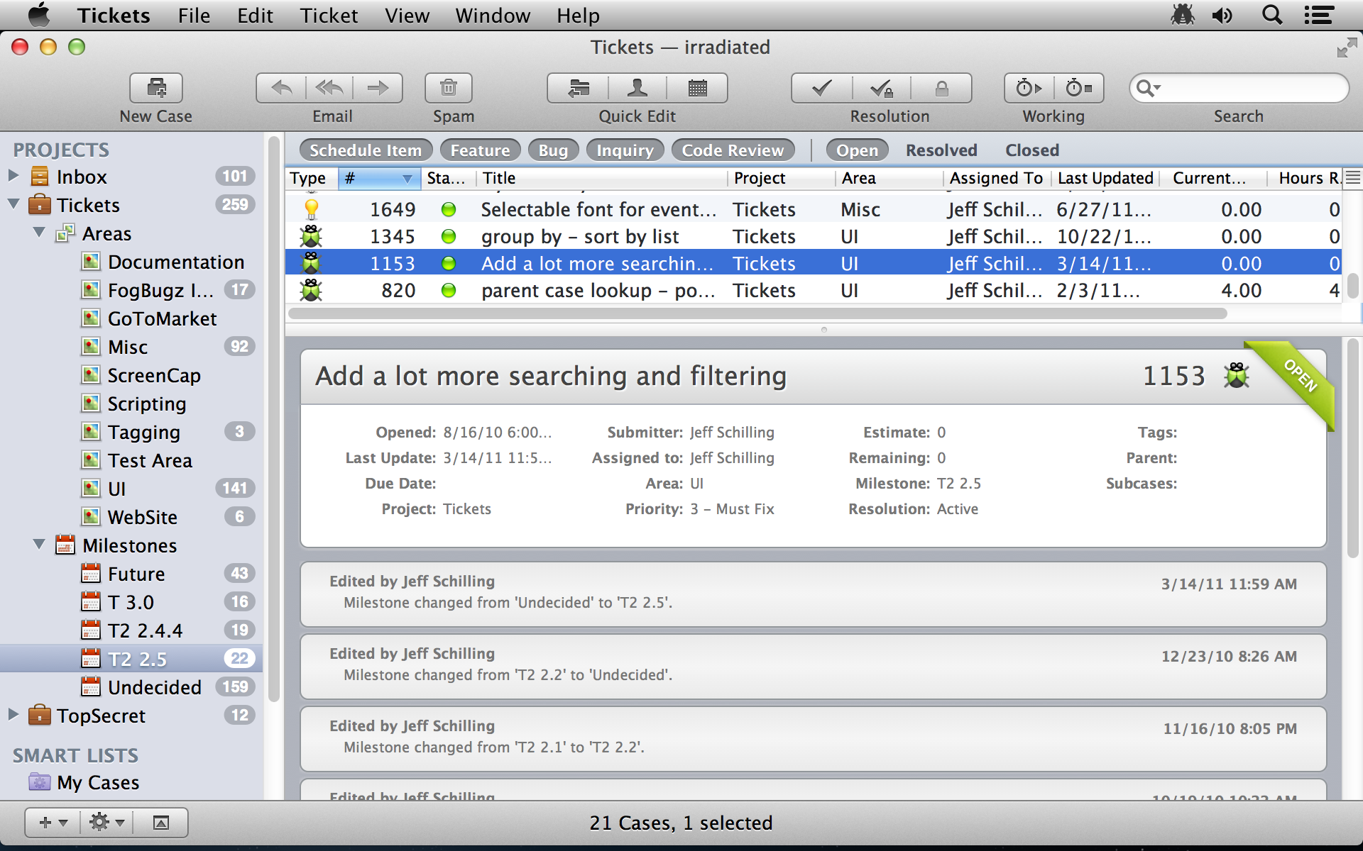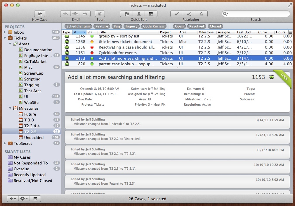 Tickets allows you to quickly create and edit FogBugz cases, including integrated screenshots and drag and drop attachments.